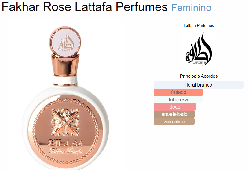 Fakhar Rose de Lattafa Perfumes é um perfume floral feminino, lançado em 2022. Uma fragrância que traduz elegância, delicadeza e sofisticação. Sua abertura é vibrante e luminosa, com uma mistura frutada envolvente de frutas, lírio, romã e aldeídos, que trazem um frescor radiante. No coração, um buquê floral exuberante de tuberosa, jasmim, gardênia, ylang ylang, madressilva, rosa e peônia, que entrega feminilidade, charme e intensidade. O fundo é cremoso e confortável, composto por baunilha, almíscar branco, sândalo e ambroxan, que conferem um toque sensual, aconchegante e marcante.