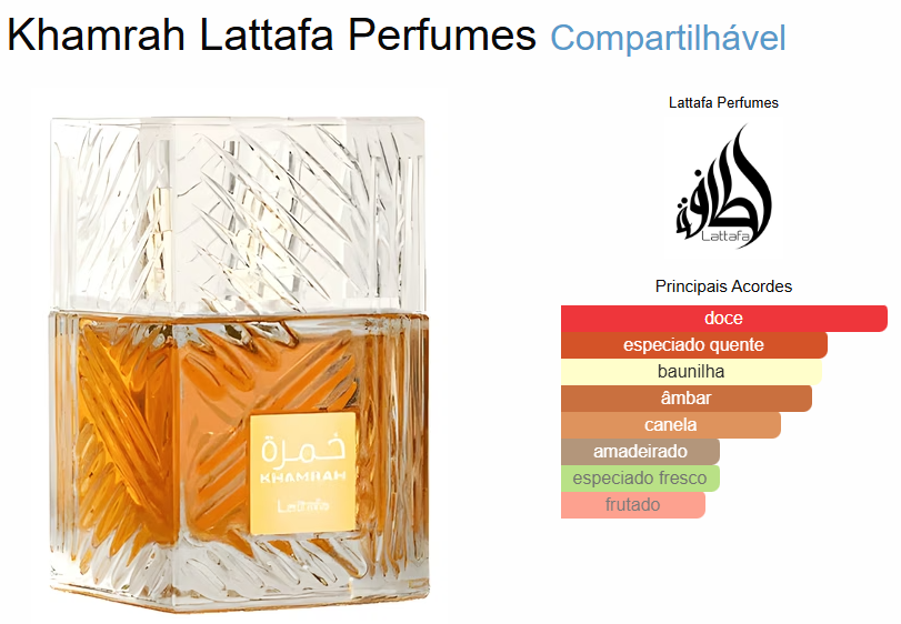 Khamrah de Lattafa Perfumes é um perfume unissex da linha oriental especiada gourmand, que exala intensidade, calor e sofisticação. Ideal para quem ama fragrâncias doces, encorpadas e sensuais, sua fórmula combina especiarias exóticas com um fundo cremoso e envolvente.
