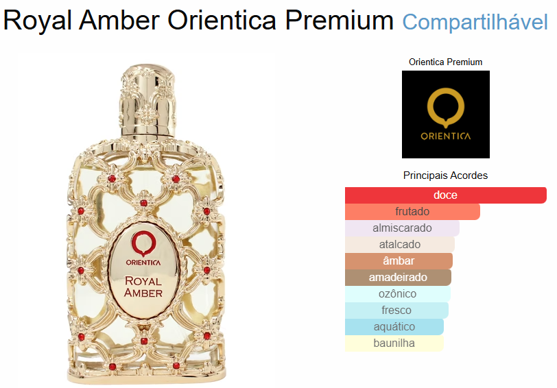Royal Amber é um perfume Ambarado Amadeirado Unissex, projetado para quem busca elegância, intensidade e sofisticação em uma fragrância versátil. A combinação harmoniosa de notas quentes e refinadas cria uma presença marcante, sem gênero.
